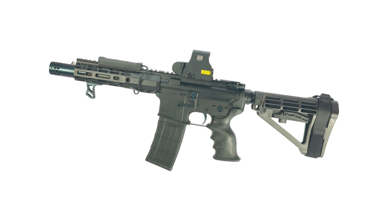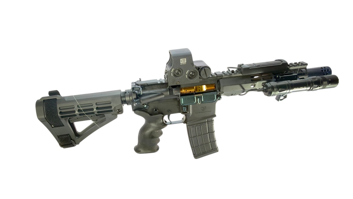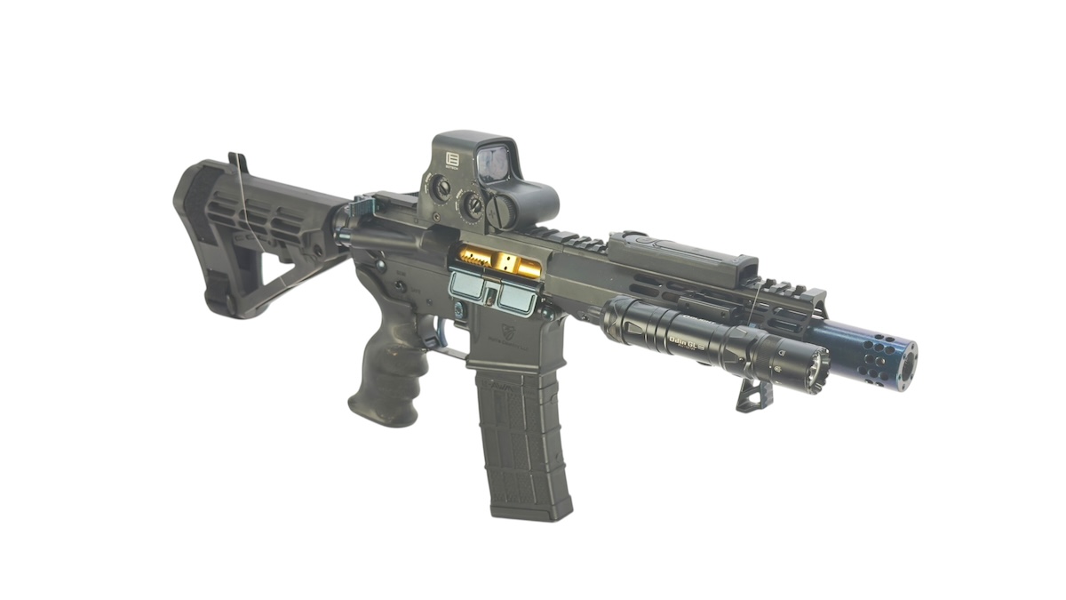 With the SBA4 pistol brace, ergonomic hand stop, and Sniper Comfort pistol grip, weapon handling feels fast, balanced, and natural. The slip-over compensator pushes blast forward, making this platform ideal for indoor defense or tight CQB environments.